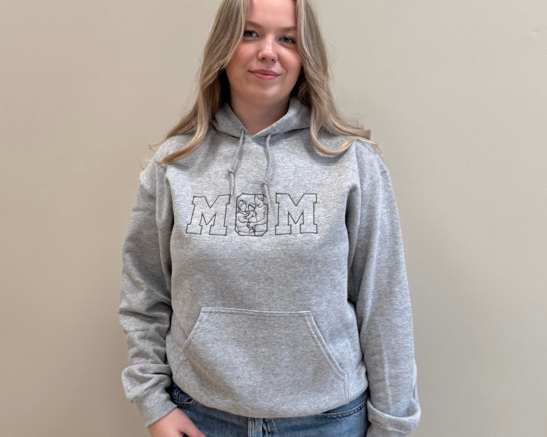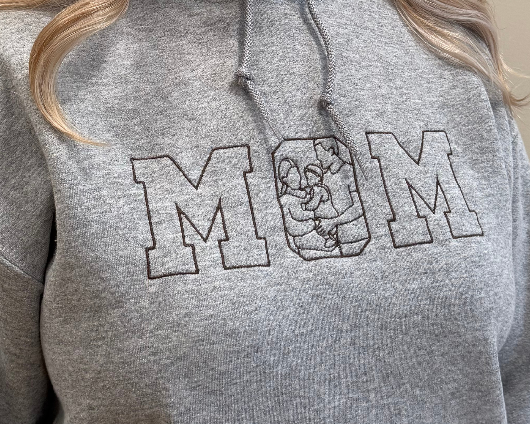 Vi tegner dit personlige outline billede ud fra dit vedhæftede billede, som derefter bliver broderet på hoodien og tilført en college outline.
